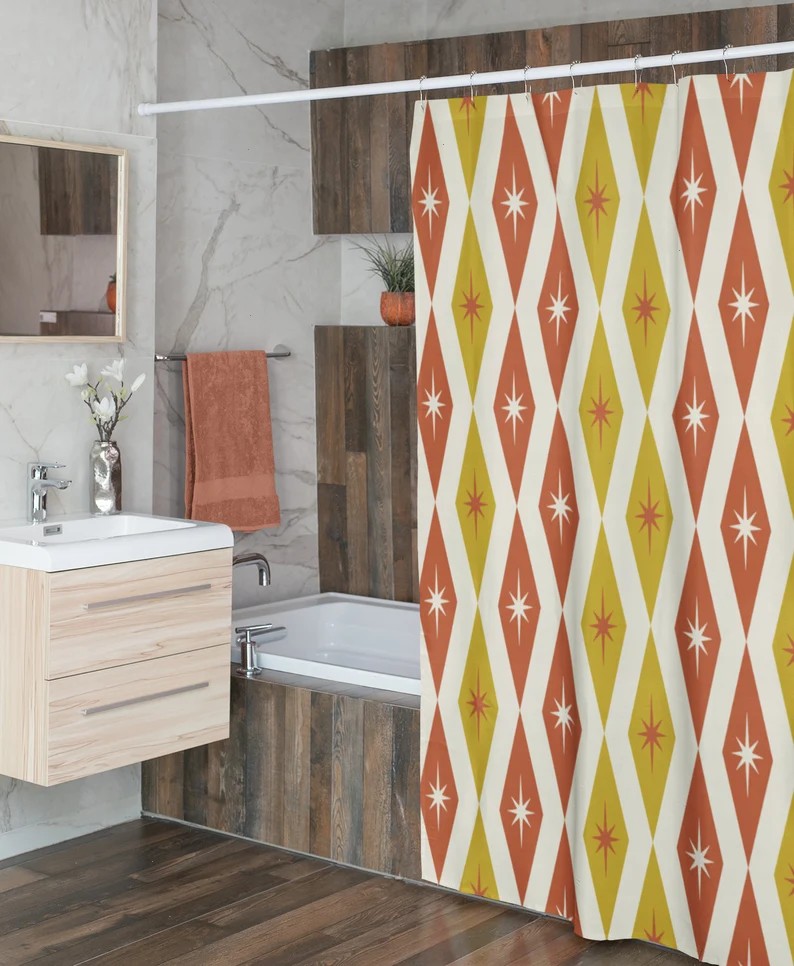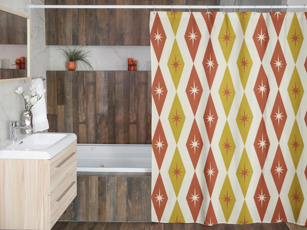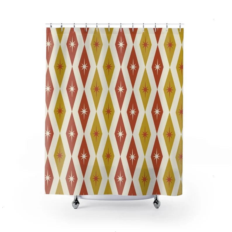 Mid Century Modern Shower Curtain With Atomic Diamonds Design, Mcm Bathroom Accessory